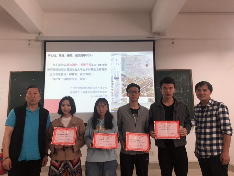 3.李心怡、陈城、杨皓、戚文娟等同学(2015级城市规划本科等):在2018全国高等院校城乡规划专业大学生乡村规划方案竞赛中,方案“育水渔村,予景与民”荣获三等奖,获科城奖学金三等奖;