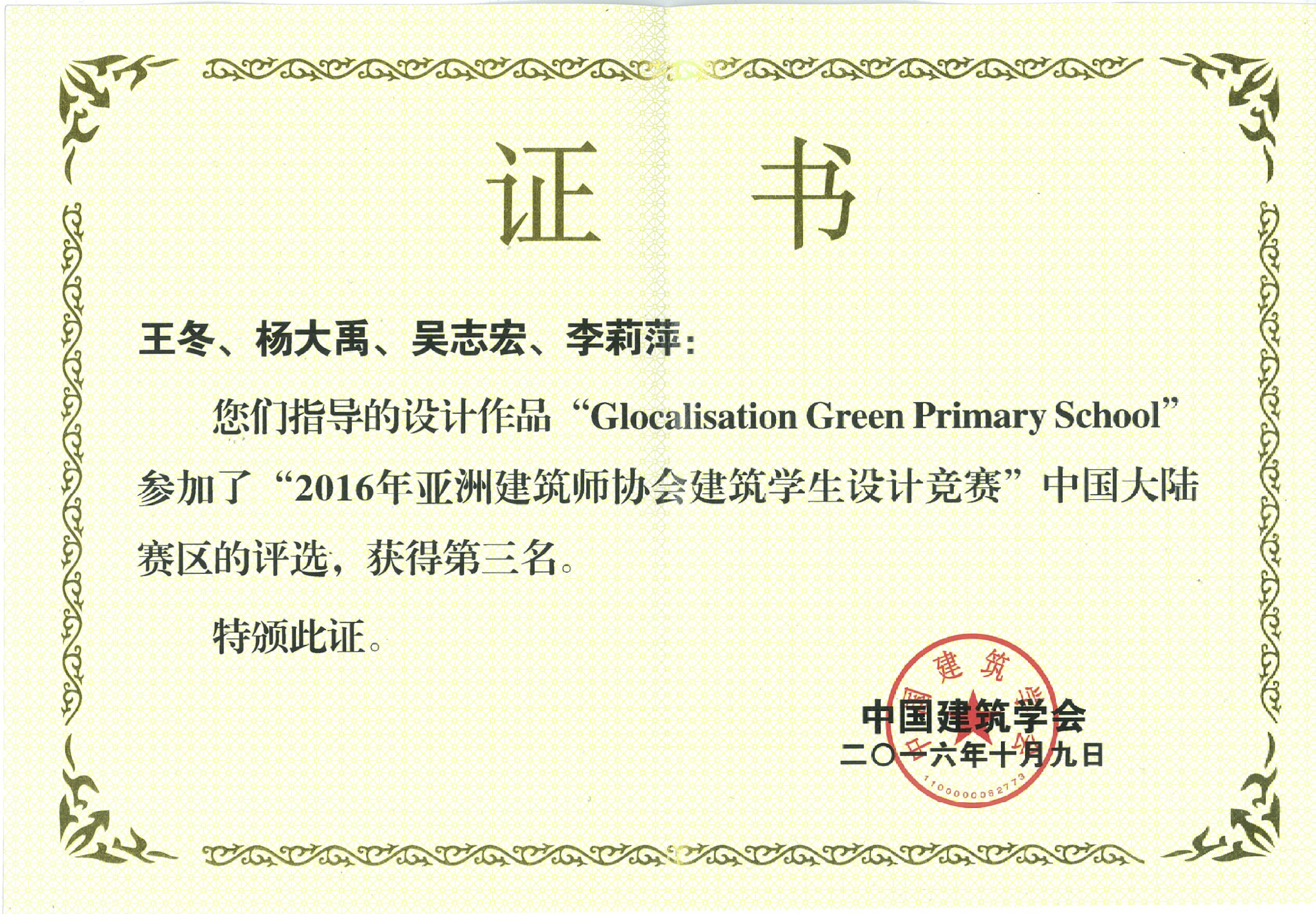 王冬、杨大禹、吴志宏、李莉萍四位老师指导,建筑学系2014级硕士研究生陶柏延、熊濯之、石文博、廖琛等同学完成的作品“海公馆小学”作为中国大陆赛区top 5的作品之一,最终获得第三名。