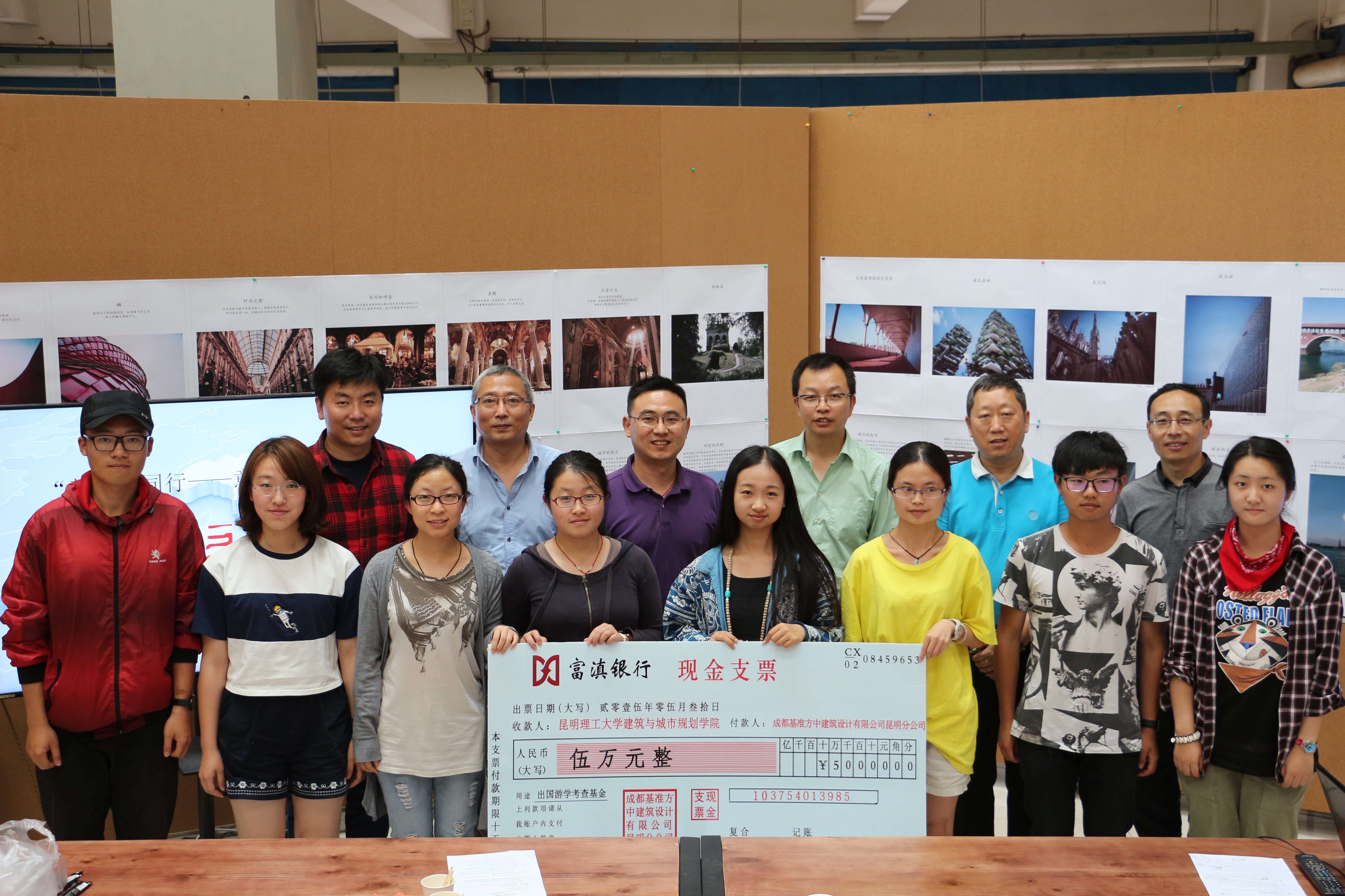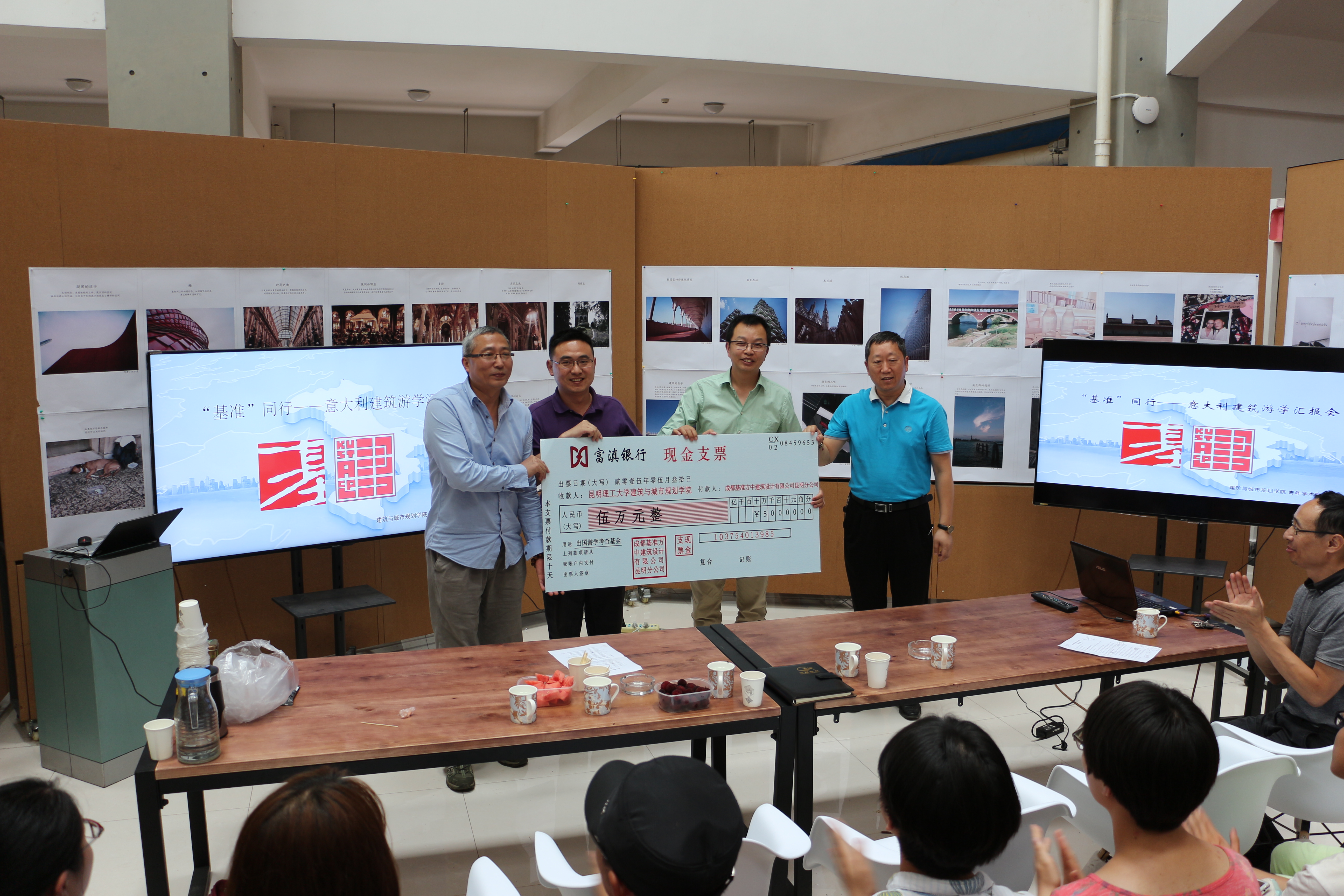 总结沙龙结束后,举行了“2016基准方中游学计划”启动仪式,学院院长助理谭良斌老师代表院长对2016游学计划的准备、游学内容挑选及同学报名和筛选情况进行介绍,并宣布通过双方审定的“2016基准方中游学计划”师生名单;随后基准方中建筑设计有限公司昆明公司总建筑师曹小军致辞,对2015游学计划活动进行点评,对2016年游学计划提出要求和寄语,最后由基准方中建筑设计有限公司昆明公司副总经理邓丹和曹小军与学院杨大禹副院长、李恒副书记进行了游学基金交付仪式,2016基准方中游学计划正式启动。