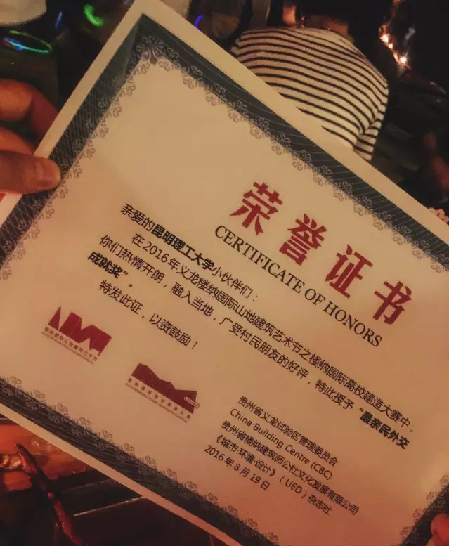 廖静和黎南老师带队、9名学生参加的参赛队,通过20天的构造,参赛作品《织竹》在本次大赛中获得了三等奖,并在大赛过程中因积极融入当地村民,虚心学习,认真请教,深受当地村民好评,被大赛组委会授予了“最亲民外交成就奖”。