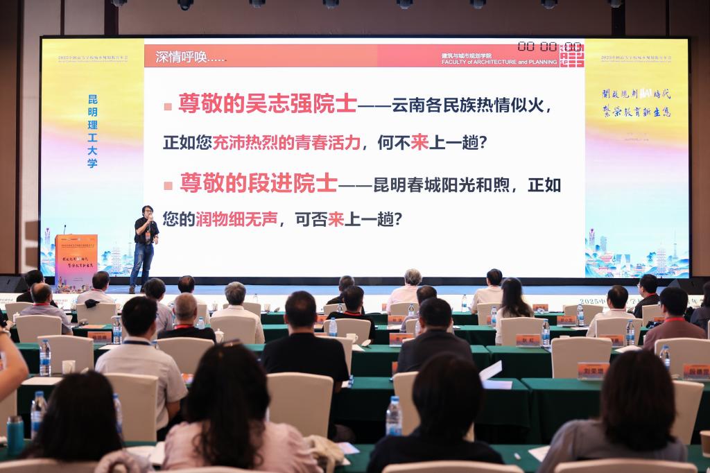 在6月28日上午的开幕式及主旨报告会议上,杨毅院长代表学校参加2027中国高等学校城乡规划教育年会申办学校竞选宣讲,系统介绍了“彩云之南、四季春城”的办会优势,“植根红土、工科翘楚”的院校发展峥嵘历史,城乡规划专业深耕“乡村乡土、地域地文、高原绿色、一体面向”的办学特色,以及学校在经费、人员、会议服务、安全保障和媒体宣传等方面的会议保障措施。