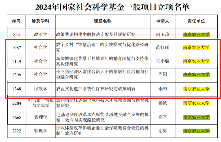 近日,全国哲学社会科学工作办公室发布了《关于2024年国家社会科学基金年度项目立项名单的公示》。今年我校国家社会科学基金年度项目立项11项,其中人文与社会发展学院立项6项,一般项目4项,青年项目2项。